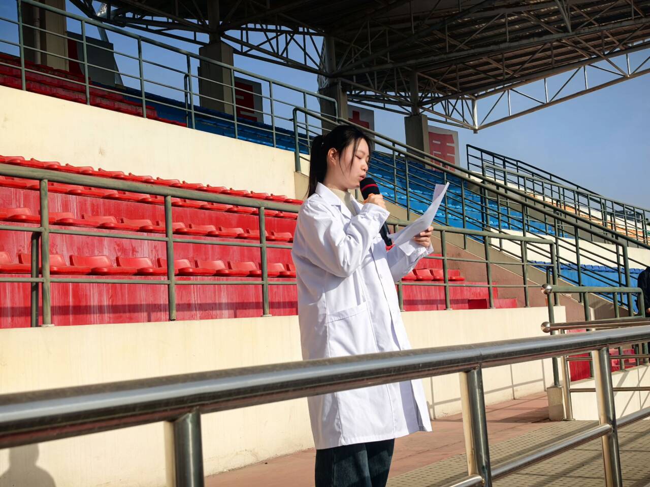 仪式结束后,24级临床1班张俊同学代表全体医学生发表题为《健康中国,医路有我》的讲话。她从医学生的学习、实践和未来职业发展等方面,呼吁同学们将个人成长融入国家卫生健康事业大局,为“健康中国”战略贡献青春力量。