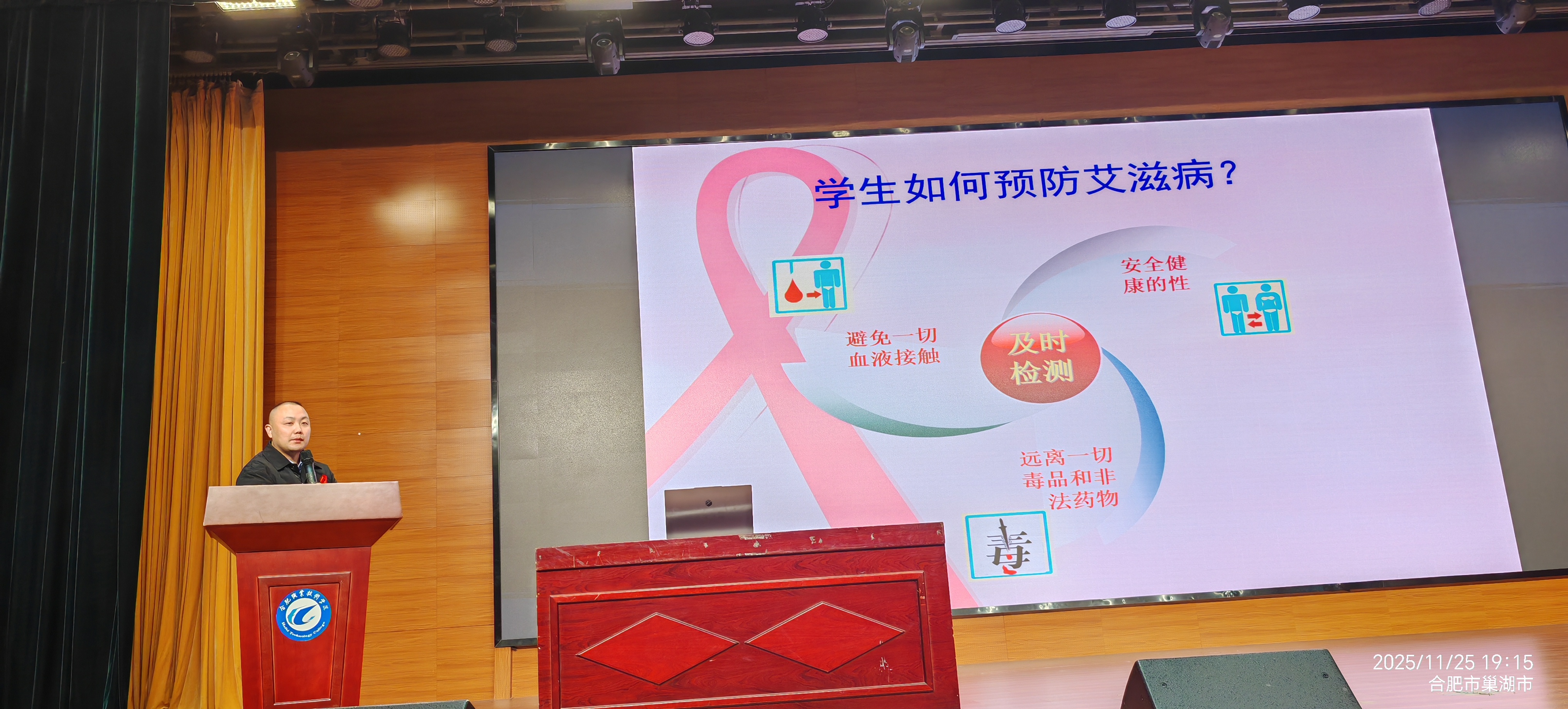 活动特邀巢湖市疾控中心资深巡讲员、防艾科专家苏冬冬主任担任主讲嘉宾。讲座环节中,苏主任以专业严谨又通俗易懂的语言,从艾滋病的致病机理、传播途径、临床症状等基础知识点切入,结合典型数据与案例,重点解读了“血液、母婴、性接触” 三大传播途径的防控要点,破除了“日常接触传染”“病毒不可控” 等常见认知误区。他特别强调,现代抗反转录病毒治疗已能将艾滋病转化为可控慢性病,引导现场观众正视艾滋、消除歧视。同时,苏主任围绕“控制传染源、切断传播途径、保护易感人群”三大防控环节,针对性给出了青少年自我保护、高危人群主动检测等实用建议,强化了“每个人都是自身健康第一责任人”的理念。