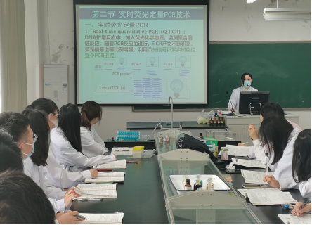 开展公开教学活动。在分子生物检验技术课程实训中,陈婷婷博士讲解了核酸检测的PT-PCR技术的原理,并指导学生进行核酸检测的实践操作。在诊断学理实一体教室,黄永平教授带领同学们进行胸部检查—心脏听诊教学,指导学生心脏听诊实操训练。