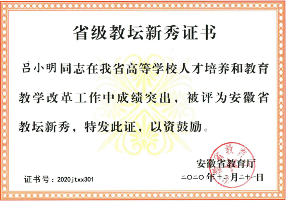 付出总有回报,“赠人玫瑰,手有余香”,吕小明多次获得“优秀教师“、“年度先进个人”、“优秀实验员”、“优秀社团指导老师”、“优秀班主任”等称号; 2017年全国高等职业院校教学能力大赛“二等奖”,2020年获省级教学成果“二等奖”;2020年获省级“教坛新秀”;入校以来获得7次教学质量考核优秀。