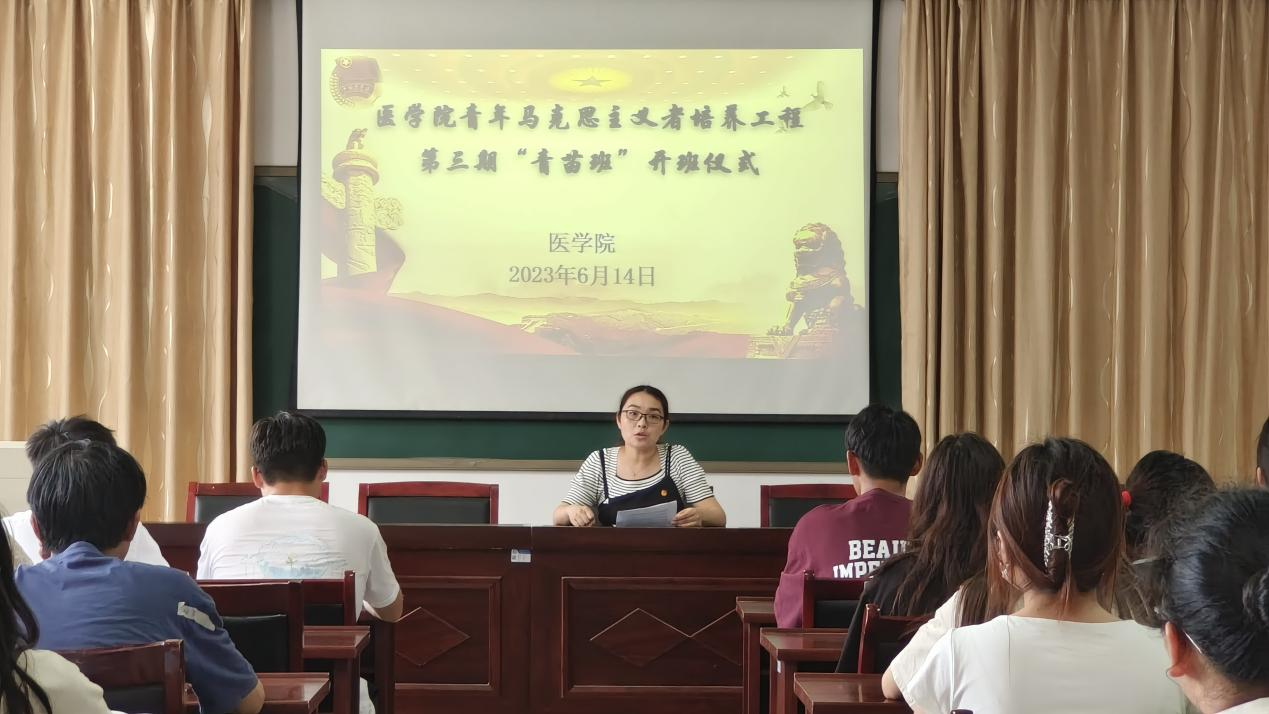 为深入学习宣传贯彻习近平新时代中国特色社会主义思想和党的二十大精神,落实习近平总书记关于青年工作的重要思想,发挥大学生骨干在培育和践行社会主义核心价值观活动中的示范带动作用,引领大学生骨干争做“有理想、有追求,有担当、有作为,有品质、有修养”的“六有”大学生,6月14日下午,sunbet申搏官方网站于护理北楼学生活动室举行了sunbet申搏官方网站第三期青年马克思主义者培养工程“青苗班”开班仪式,全体学员出席,仪式由sunbet申搏官方网站团总支书记刘惠主持。