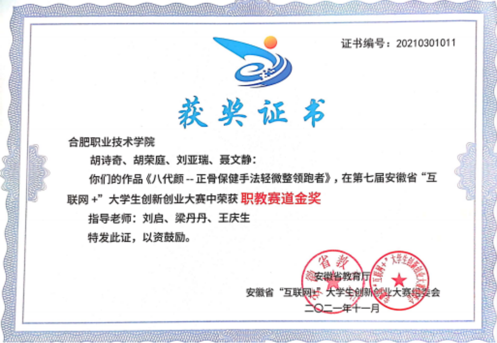 积极指导学生参加专业技能竞赛和相关创新创业大赛。2019年指导学生获得安徽省大学生康复治疗技术技能竞赛一等奖,2020年指导学生获得第十届全国大学生电子商务“创新、创意及创业”安徽省赛区选拔赛二等奖,2021年指导学生获得第七届安徽省“互联网+”职教赛道金奖。