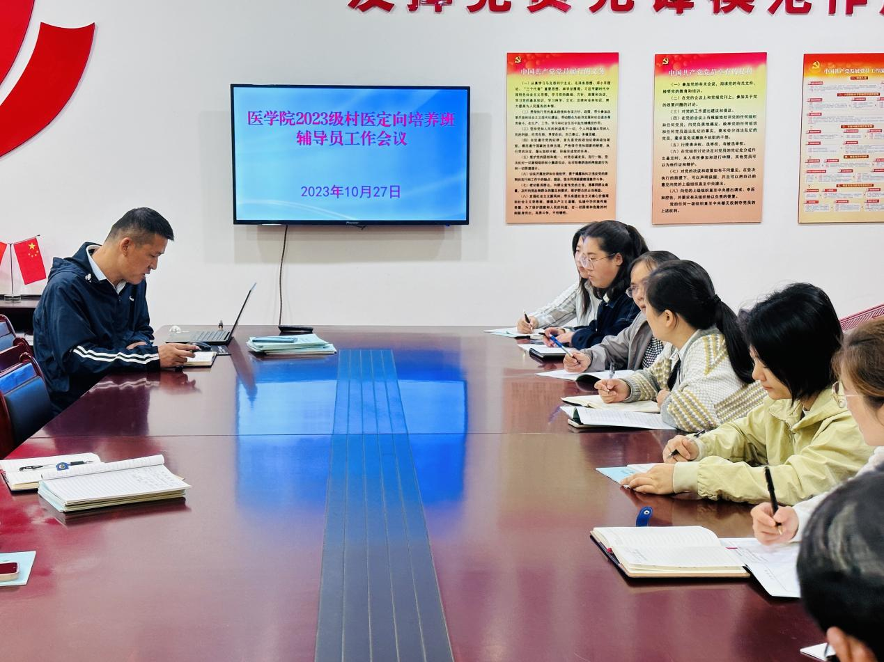 为更好地做好2023级村医定向培养班学生管理,部署落实新生学籍信息核查等工作,10月27号上午,医学院在医学楼党员活动室召开全体2023级村医定向培养班辅导员会议。医学院党总支副书记(主持工作)邹华兵、全体2023级村医定向培养班辅导员参加了此次会议,会议由学院学工办主任孙亚萍主持。