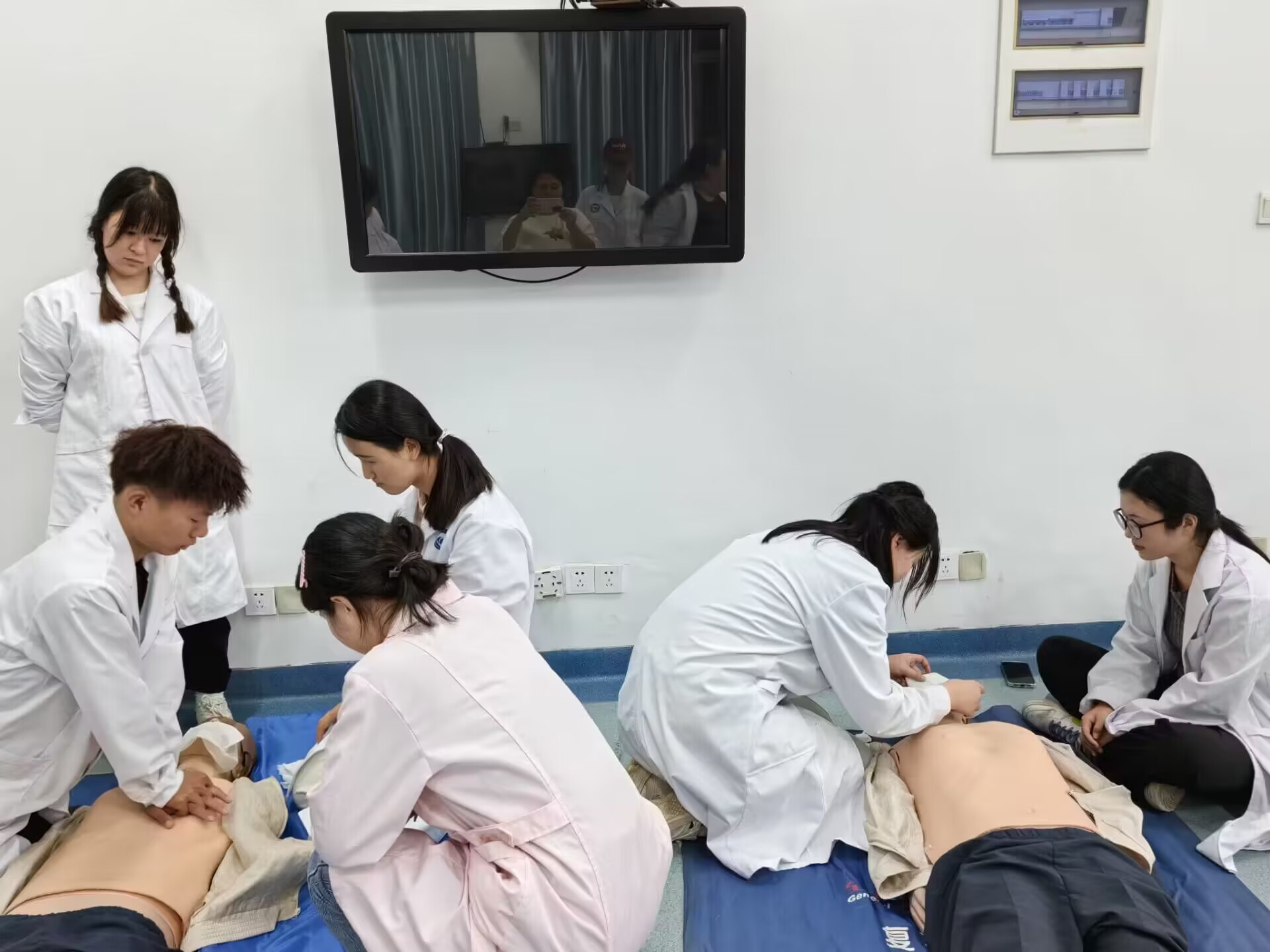 此次培训师资团队由经安徽省红十字会培训的培训导师和学生助理共同完成。培训方式采用理论上大课,实践操作分小组由助教指导并督促完成。培训内容包括心肺复苏、止血和包扎等急救知识和技能,其中重点培训的是心肺复苏。