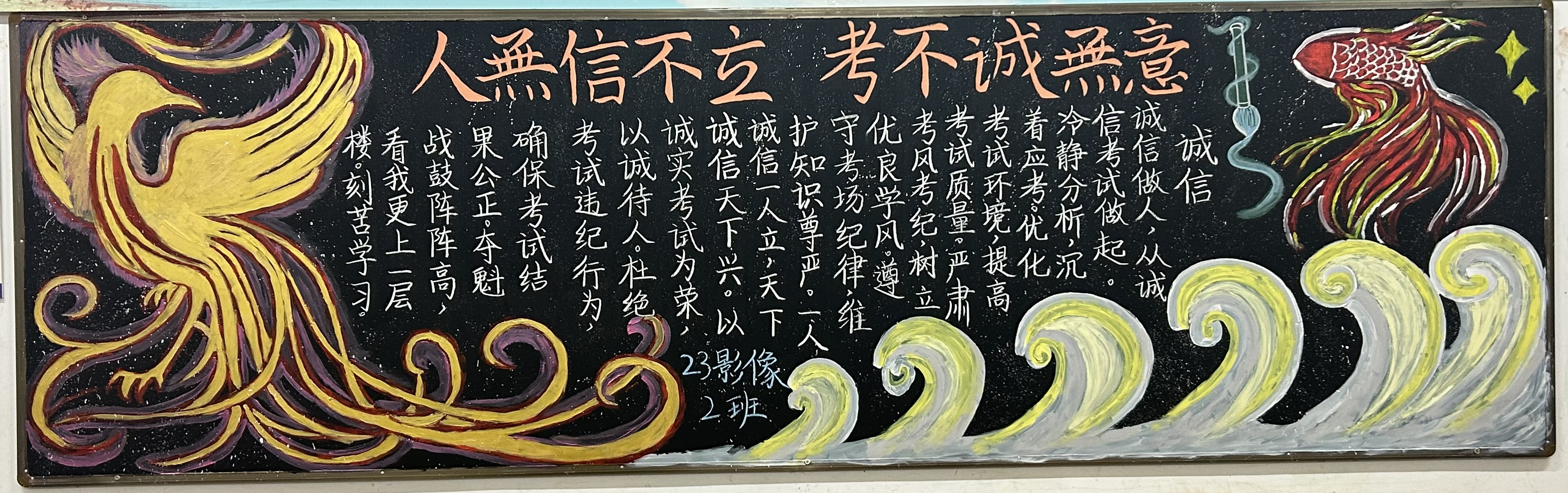 本次黑板报活动中,各班级同学积极参与,紧扣本次“诚信”主题,通过多种元素、绘画材料呈现出精彩的黑板报作品。展现了同学们对于诚信的理解,并发出倡议:认真复习备考、严格遵守考试记录、诚信做人、诚信考试。