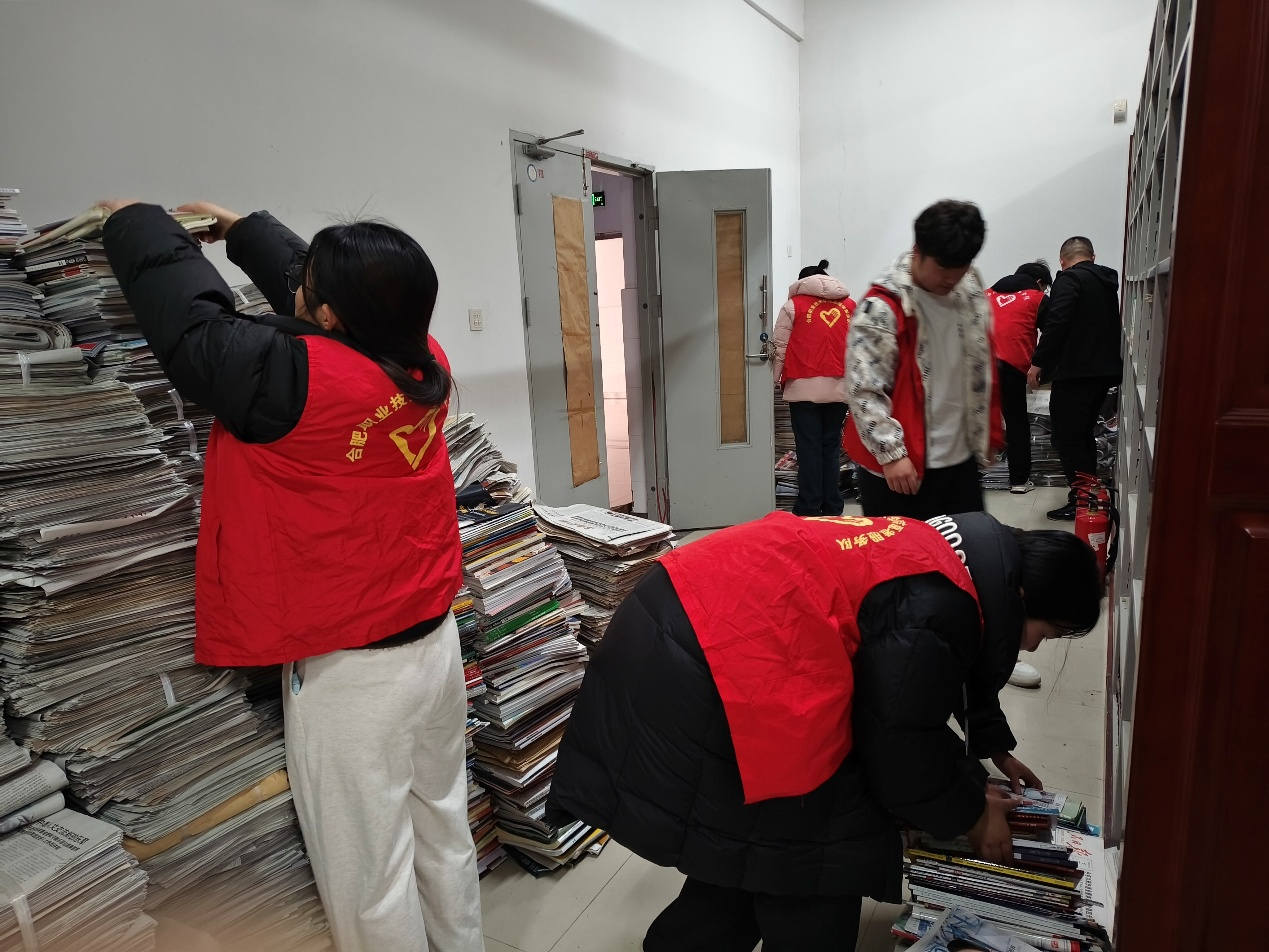 一楼报刊室,志愿者们身着红马甲,收集着旧杂志。按照指示将其搬运至图书储藏室。部分同学则是于储藏室内摆放旧书籍,同学们轮番上阵书架间的过道成了流动的战场,卸下的报刊堆成彩色的山脉,曾经东倒西歪的书籍已然变为等待检阅的士兵整齐排列。