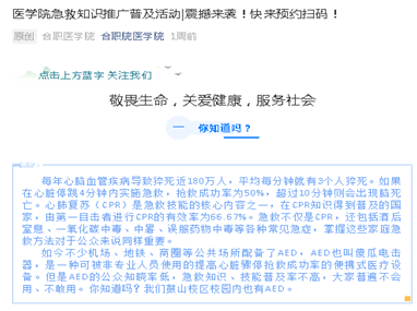 依托大学生群体开展合肥地区急救知识推广普及,探索建立急救知识梯队式推广普及模式,建立局域地区急救知识推广全覆盖培训体系具有重要意义。让我们携手加入急救知识推广普及队伍,共同奋斗!