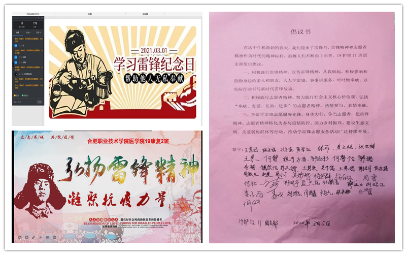 活动以班级团支部为单位开展,形式丰富多样。19助产1班团支部开展了“传承雷锋精神,弘扬时代正能量”主题团课,从雷锋同志的生平事迹,雷锋精神的具体表现,以及作为当代青年大学生如何学习雷锋精神等角度进一步阐述了“团员意识”。20医检4班团支部开展了“雷锋精神永流传”主题研讨活动,通过分享自己身边的“雷锋”故事,呼吁同学们用行动践行“雷锋精神”,积极参与到各类志愿服务活动中来。19护理11班级团支部,在班级里发起了倡议,号召大家积极学习雷锋精神,自觉参与志愿服务活动,在行动中谱写更多新时代的雷锋故事。
