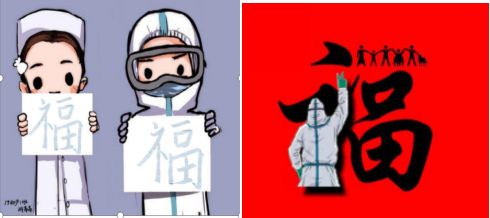 20影像2班的宋晓晓设计的“福”是由医护人员手举莲花,防护服的帽子由11个(“牛”在十二生肖中排行倒叙就是第11)不同的“福”字围成,寓意在新的一年里好运连连。19助产2班的陆佳将医护人员设计在福字中间,作为福字中的一竖,寓意顶梁柱。