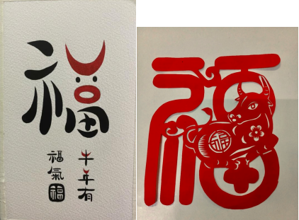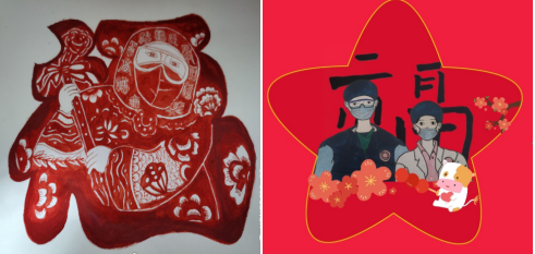 20康复5班宋思婕的书法作品“牛”转乾坤和19康复5班刘亚瑞的剪纸福字致敬医护的无畏付出,也为更多人送上新春平安健康的祝福。