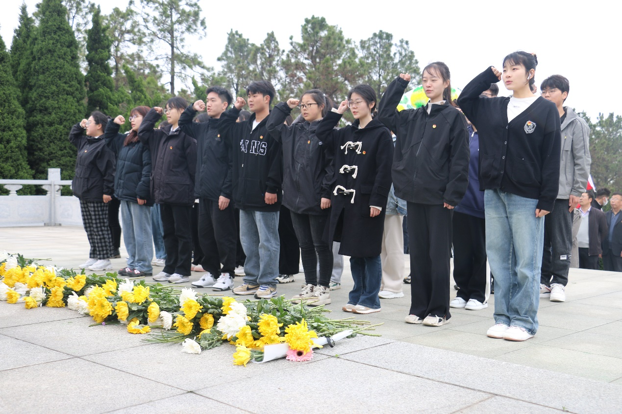 在铭记历史中汲取精神力量,在抚今追昔中坚定前行意志。面对纪念碑,团总支书记刘惠带领同学们重温入团誓词,回溯初心,铭记使命。铮铮誓词,生动诠释了中国共产党人“生的伟大,死的光荣”的崇高追求,让每一位团员青年深切感悟“捐躯赴国难,视死忽如归”的伟大精神力量。