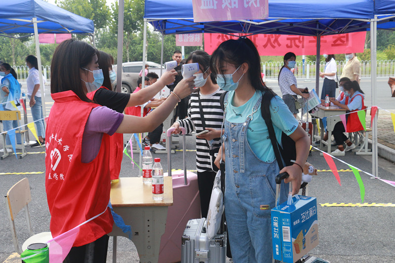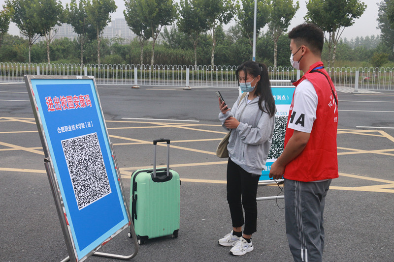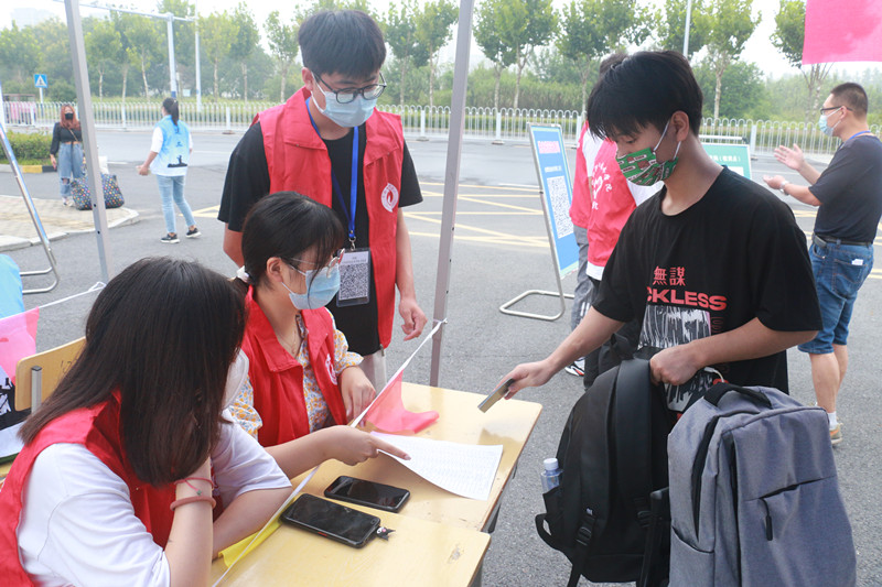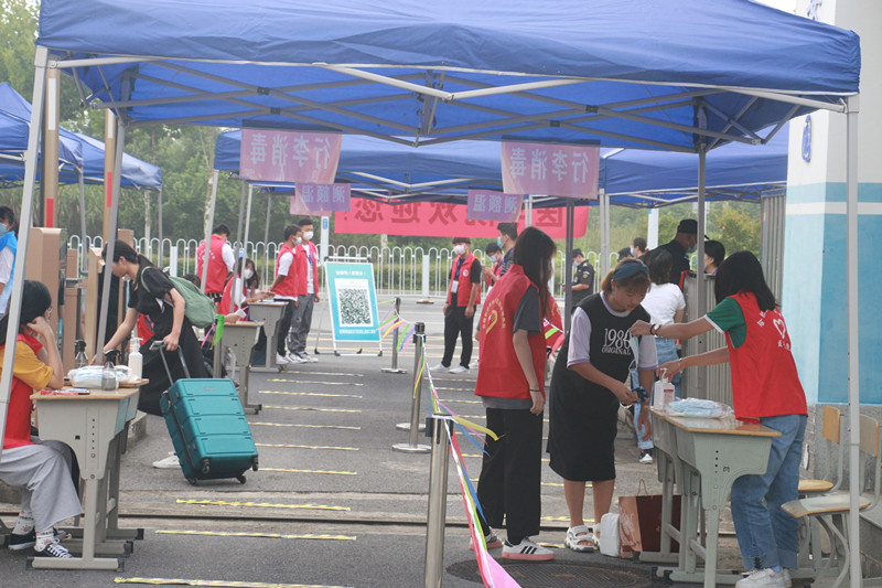 早上七点,各工作组人员已经全部到位,严格按照学校疫情防控相关要求,用扎实细致热情的工作做好学生安全返校工作。学生们按照计划时间到达校门口,在“一米线”间隔排队、先后进行安康码核查是否绿码、疫苗接种与否、14天行程有无异常、核酸检测报告是否阴性等信息核验、测额温、行李与手消毒、更换口罩、信息登记等多个环节,报到现场井然有序。