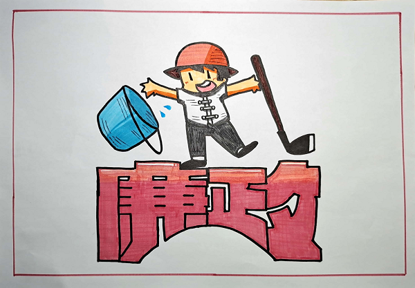 作品简介:图中人物左边是一桶清水,表现的是清廉的“清”字,右边是一把镰刀,表现的是清廉的“廉”字,人物站在以“清廉”为形的桥上。即清水把走过桥上污浊的人洗净,镰刀铲去歪风邪气。