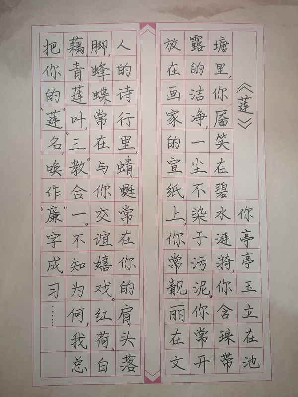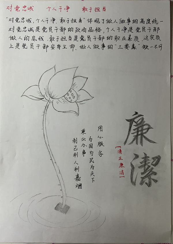 作品简介:作品以莲喻廉,通过对莲的品性描写,突出其亭亭净植,不蔓不枝,出淤泥而不染的特点,倡导一尘不染的廉洁风气。