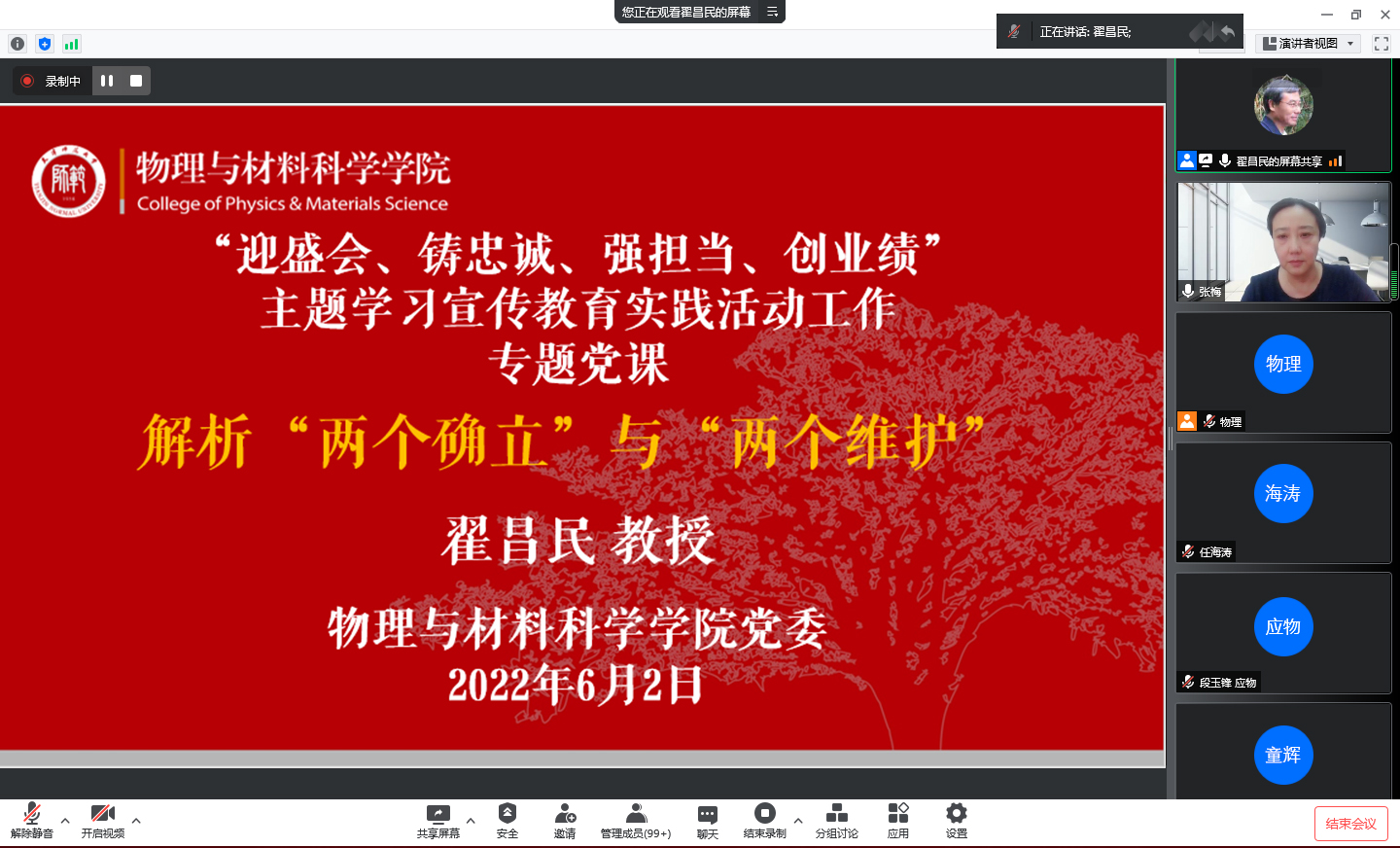 6月2日下午,开云kaiyun官方网站党委邀请学校关工委报告团成员、政治与行政学院教授翟昌民作题为《解析“两个确立”与“两个维护”》专题党课。学院全体教职工和学生党员在线上聆听。会议由学院党委书记张梅主持。