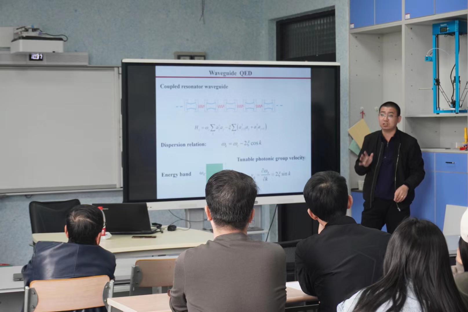 王治海介绍了波导量子电动力学研究受限的电磁场与物质之间的相互作用,探讨了非线性物质对光与原子动力学行为的影响。报告分为两个部分,第一部分研究非线性耦合腔阵列系统中双光子束缚态诱导的超关联辐射;第二部分研究一维拓扑耦合腔阵列波导与巨原子相互作用系统,探讨巨原子系统中延迟效应带来的非马尔科夫效应。报告结束后,在场师生结合所研究方向与王治海进行深入探讨。