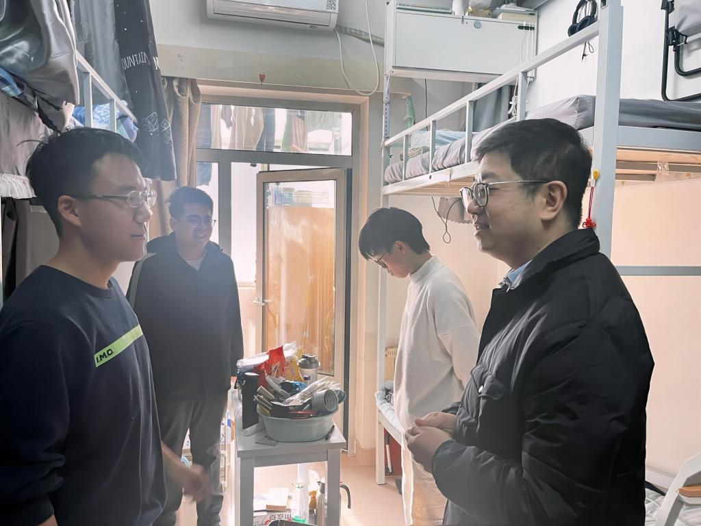 在学生公寓26号楼走访过程中,学院领导老师与2023级本科生进行了面对面、点对点沟通交谈。张伟勉励学生,作为新时代物理青年,要抓住人生中最宝贵的大学时光,励志勤学、刻苦磨炼,坚定不移听党话、跟党走,在激情奋斗中绽放青春,努力成长为担当民族复兴大任的时代新人。张伟还向同学们了解了校园生活情况,嘱咐同学们近期寒潮来袭,要及时根据天气变化增加衣物,注意防寒保暖。希望同学们要相互关照,尤其是天津籍学生要主动帮助外省市同学了解天津、融入天津,更加热爱我们求学的城市。