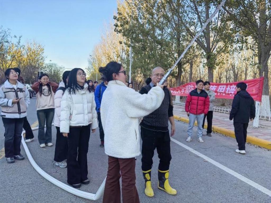 室内消火栓是最常见的建筑消防灭火设施,张辰昊为同学们讲解了消防水带和水枪等器材的配套使用方法,同学们亲自体验了使用消火栓的整个过程。