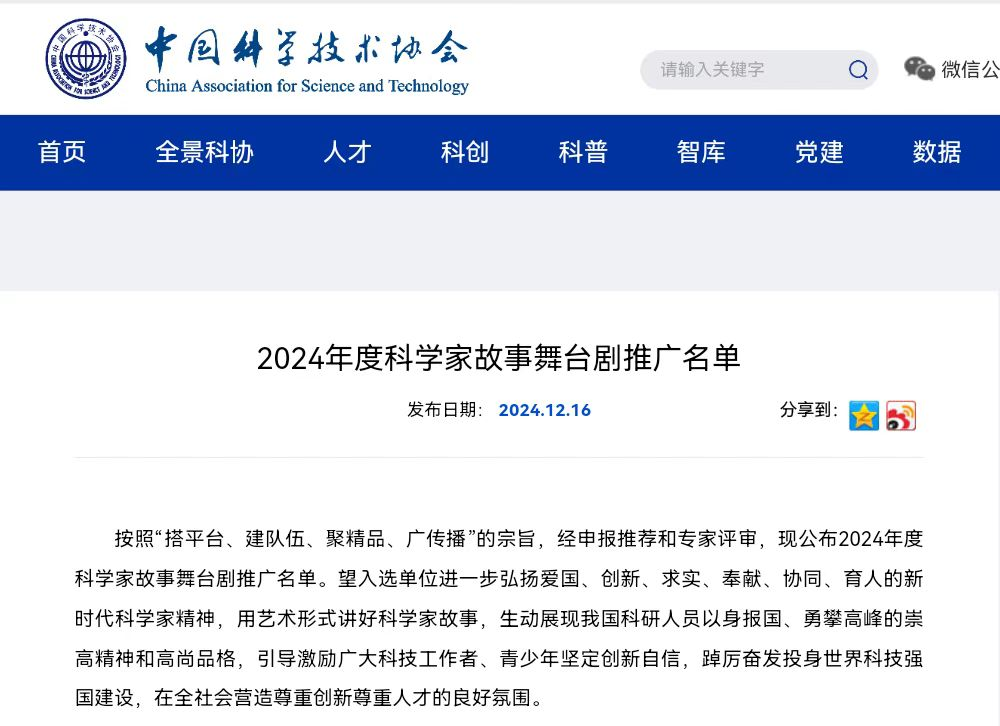 近日,中国科协2024年度“科学家故事舞台剧推广行动”名单公布,开云kaiyun官方网站原创舞台剧《邓稼先》入选优秀中短剧推广名单,是2024年天津市高校唯一入选的剧目。