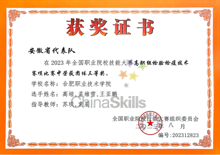 8月5日,由教育部、科技部、工信部等35个单位主办,山东省教育厅、临沂市人民政府和山东省卫生健康委员会承办,山东医学高等专科学校协办的2023年全国职业院校技能大赛高职组“检验检疫技术”赛项在山东医学高等专科学校开赛。全国28个省、自治区、直辖市的53支代表队的近200名教师和159名参赛选手参加本次比赛。申搏官网sunbet申搏官方网站医检专业高培、孟维雪和王亚鹏三位同学荣获团体三等奖。