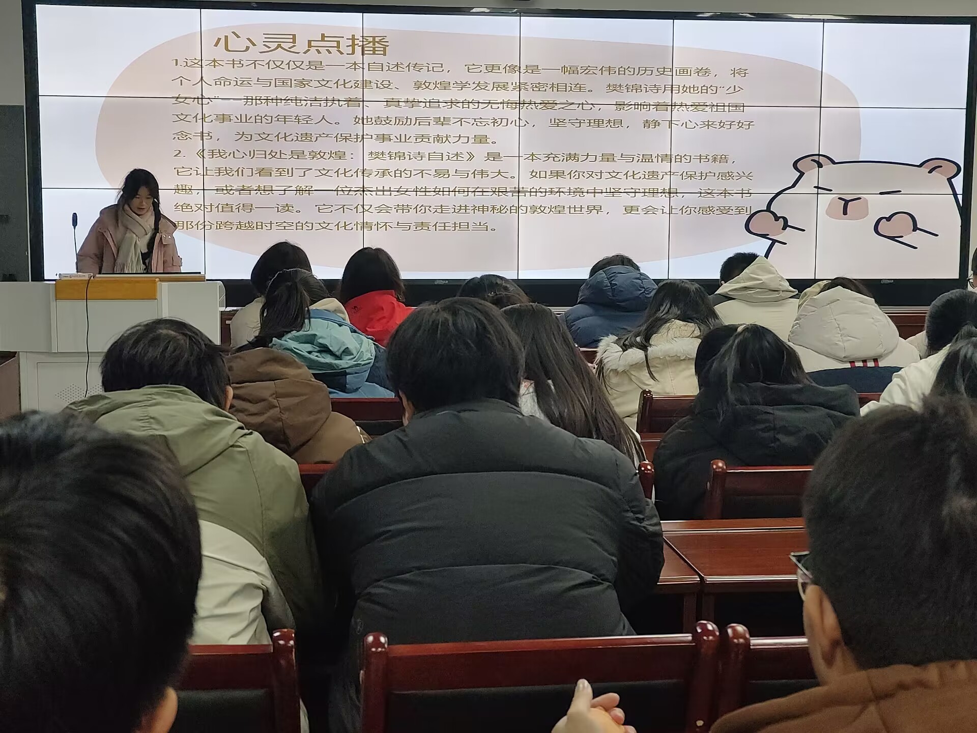 活动中,同学们依次上台展示自己所分享的书籍内容,同学们所选择的分享内容体现了他们对廉洁文化主题的思考。本次分享,有同学从历史角度出发,通过《中华廉洁文化史》《读懂百年党史》等揭示在当代了解中华廉洁文化的发展过程,目的在于将传统廉洁文化推陈出新,古为今用,赋予其鲜活的时代价值,为当代廉洁文化建设提供史鉴;有同学以中华传统审美艺术文化为切入点,通过《我心归处是敦煌:樊锦诗自述》展示敦煌的女儿樊锦诗五十多年坚守大漠、守护敦煌,积极开展国际合作,以高精科技向世界展现中国传统艺术之美的动人故事;还有同学分享《习近平的七年知青岁月》《红色延安的故事(清风廉洁篇)》《红旗渠精神》等书籍,展示中国共产党人在艰苦环境下的操守坚持。阅读这些书籍,给了同学们精神的滋养、心灵的洗礼和思想的升华,让同学们明白不论环境如何艰难,都要知廉洁之义,守廉洁之心,做廉洁之人,坚定理想信念,不惧诱惑挫折。
